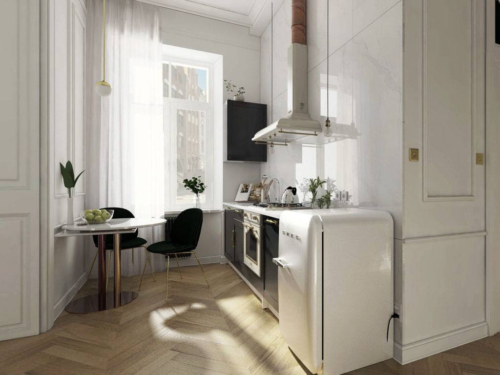 Тогда кухня в коридоре также будет выгодным решением, которое сэкономит пространство. Мы обычно используем кухонные шкафы в таких проектах. Они практичны, потому что многое в них можно спрятать.