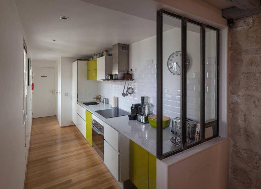 Однако сторонники вместительных ящиков или эстетических полок не должны разочаровываться нашими идеями. Как и в небольших квартирах, достаточно раковины, микроволновой печи с духовкой, нескольких конфорок и небольшого холодильника. Также откажитесь от занимающих много места: вытяжки и посудомоечной машины.