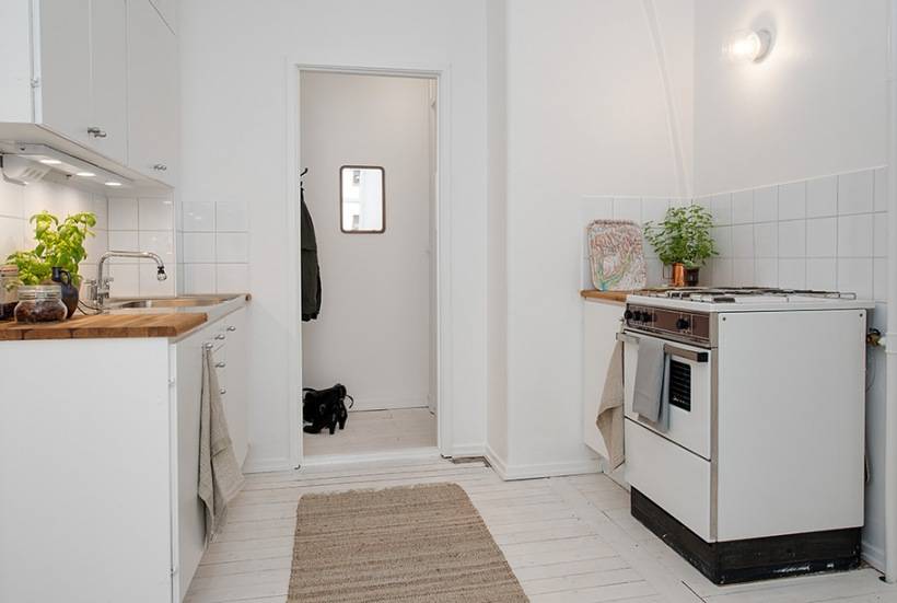 - Входная дверь открывается прямо в кухонное помещение, что не очень правильно с точки зрения гигиены. Придётся подумать, как справиться с уличной грязью и сохранить в безопасности уличную одежду.