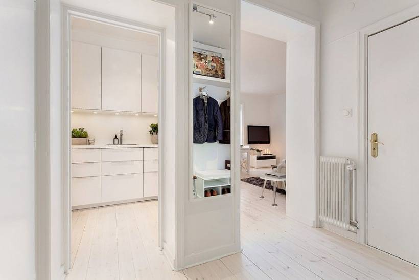 Маленькая комната должна быть максимально функциональной и вмещать в себе все необходимые вещи хозяев: обувь, сумки, зонты, верхнюю одежду. Для увеличения пространства в комнате используйте встроенные шкафы, шкафы-купе, вешалки и полки.
