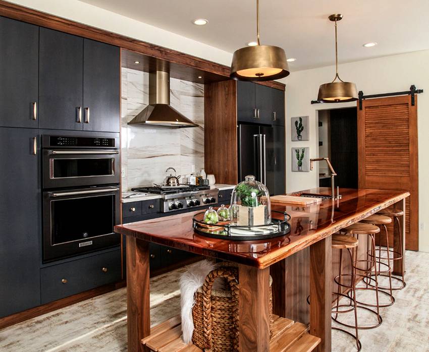 Глянцевый и матовый «кабанчик» весьма эффектно выглядит в дуэте с белыми/черными фасадами гарнитура и в сочетании с деревом холодных и теплых оттенков.