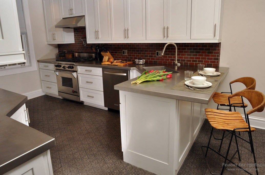 - На кухне с угловым гарнитуром будет целесообразно установить столешницу на консолях под углом 90 градусов. Таким образом, планировка напоминает букву П. Барная стойка служит продолжением гарнитура, находясь с ним на одном уровне. Такой вариант размещения чаще всего используется в студиях, но и в отдельных кухнях такая конструкция также будет уместна. Чтобы добавить стильности помещению, можно выбрать двухуровневую модель барной стойки. В этом случае нижняя столешница высотой 86–90 см является рабочей поверхностью, а верхняя, чуть выступающая вперед, используется по прямому назначению для гостей и домочадцев. Ее высота должна быть на 30 см больше нижнего яруса.