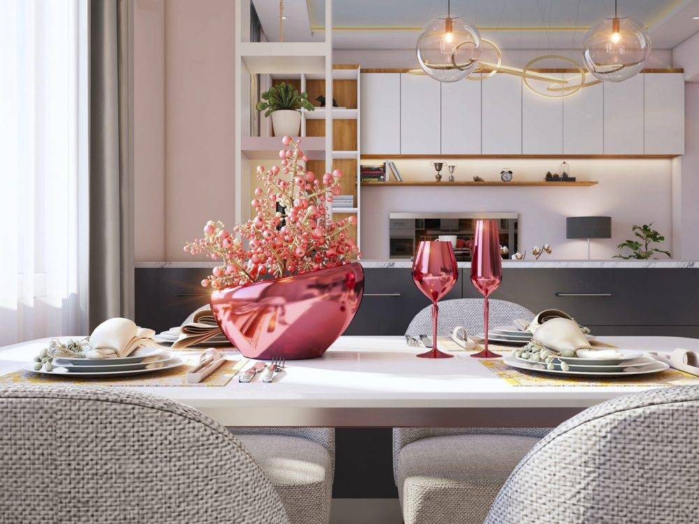 - Необычно романтично, воздушно выглядит кухня в бело-розовом цвете, возможно с дополнением дымчато-серого.