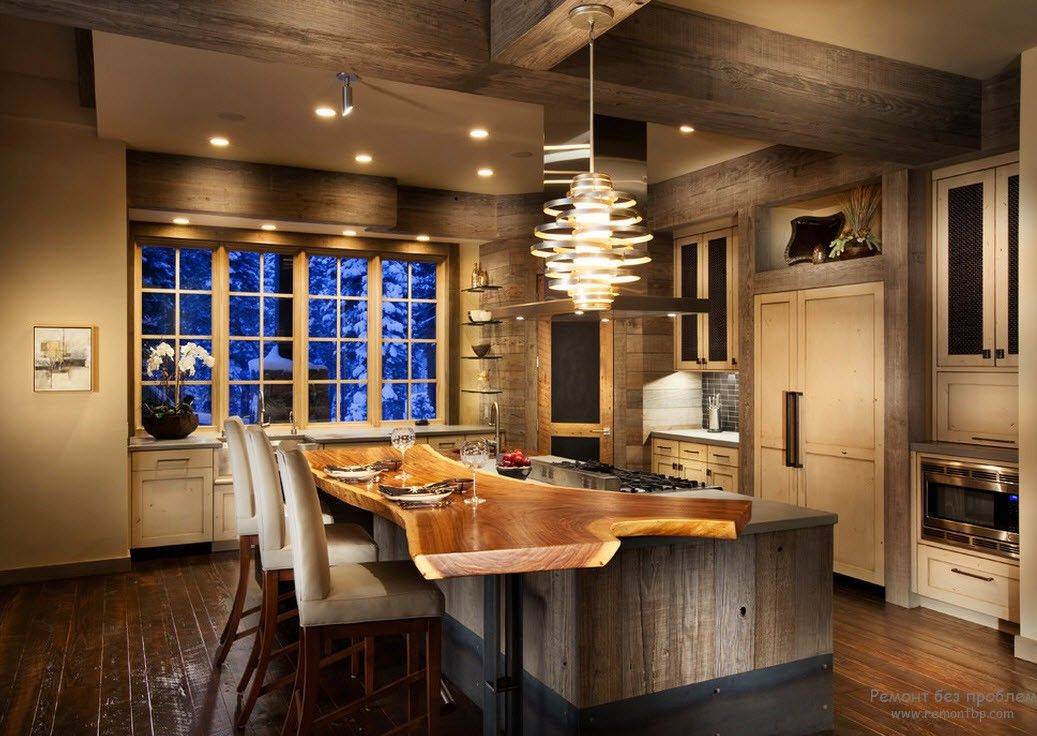 Стулья для обеденного стола и барной стойки выбирайте однотипные, лучше простые деревянные. Отсутствие лака и краски сделает их идеальными для данного направления дизайна.