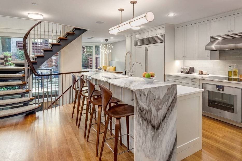 Дополните ее нижнюю часть барной стойкой прямоугольной формы – и вы получите не только стильный интерьер, но и еще одну рабочую поверхность.