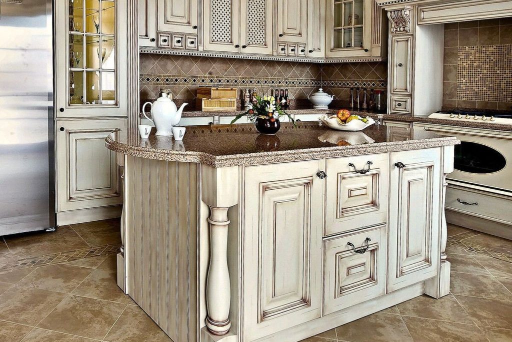 В дизайне кухонь с патиной следует учесть только одну деталь: декор будет смотреться изысканно только в подходящем интерьере и при грамотно подобранном кухонном гарнитуре.