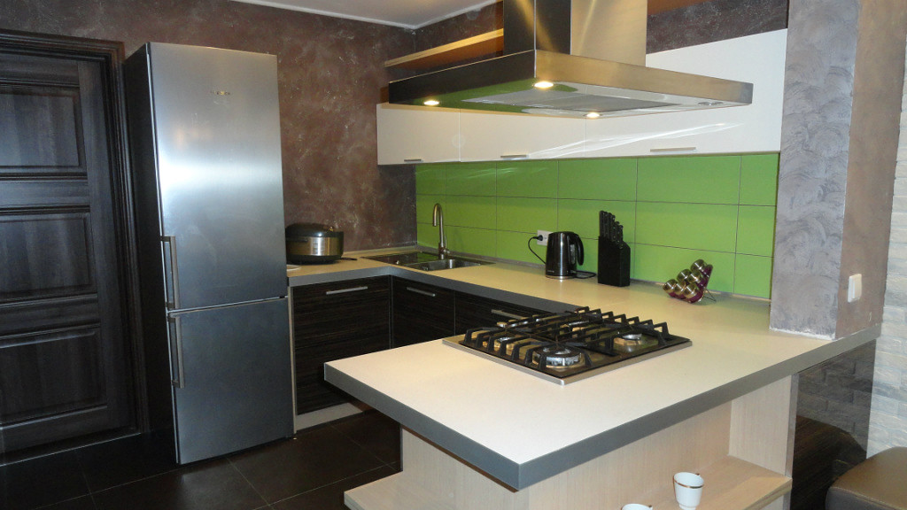 - Более того, очень маленький полуостров можно ставить даже в обычных кухнях высотных домов. Главное, отыскать оптимальный размер. Вызовите специалиста, какой сделает просчеты и имейте в виду, что с абсолютно любой стороны обязано остаться много пространства для прохода.