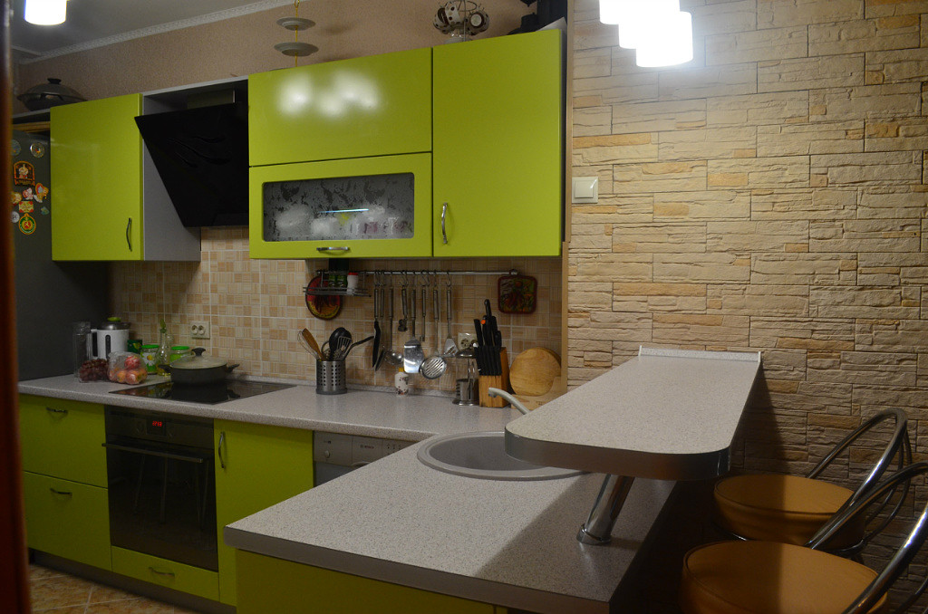 Такая конструкция позволяет сэкономить пространство, ведь она занимает меньше места в отличие от островной. Установить ее можно как в большой и просторной комнате, так маленькой квартире. Особенно актуален такой вариант в небольших квартирах-студиях, в которых кухня объединяется с гостиной.