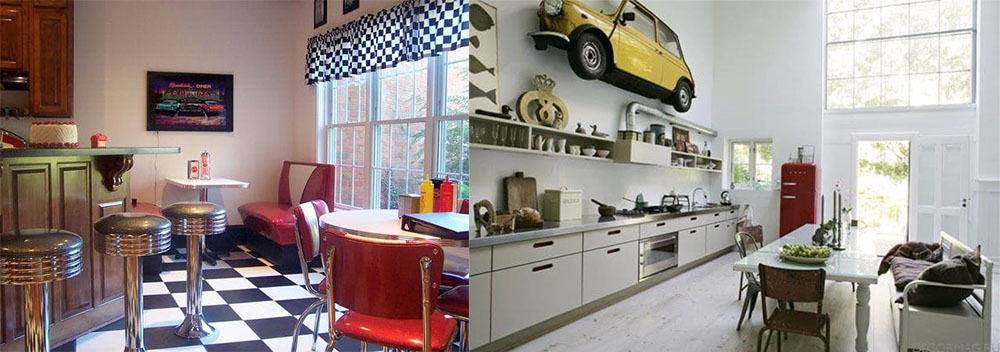 - ретро 50-60-х годов – еще более смелый и выразительный. Здесь найдут место яркие эксперименты с отделкой, а лаконичная по дизайну мебель подчеркнет современные нотки. Приукрасить такую кухню можно тематическими постерами, картинами, панно, наклейками и другими деталями, которые выделят ее тематическую направленность.