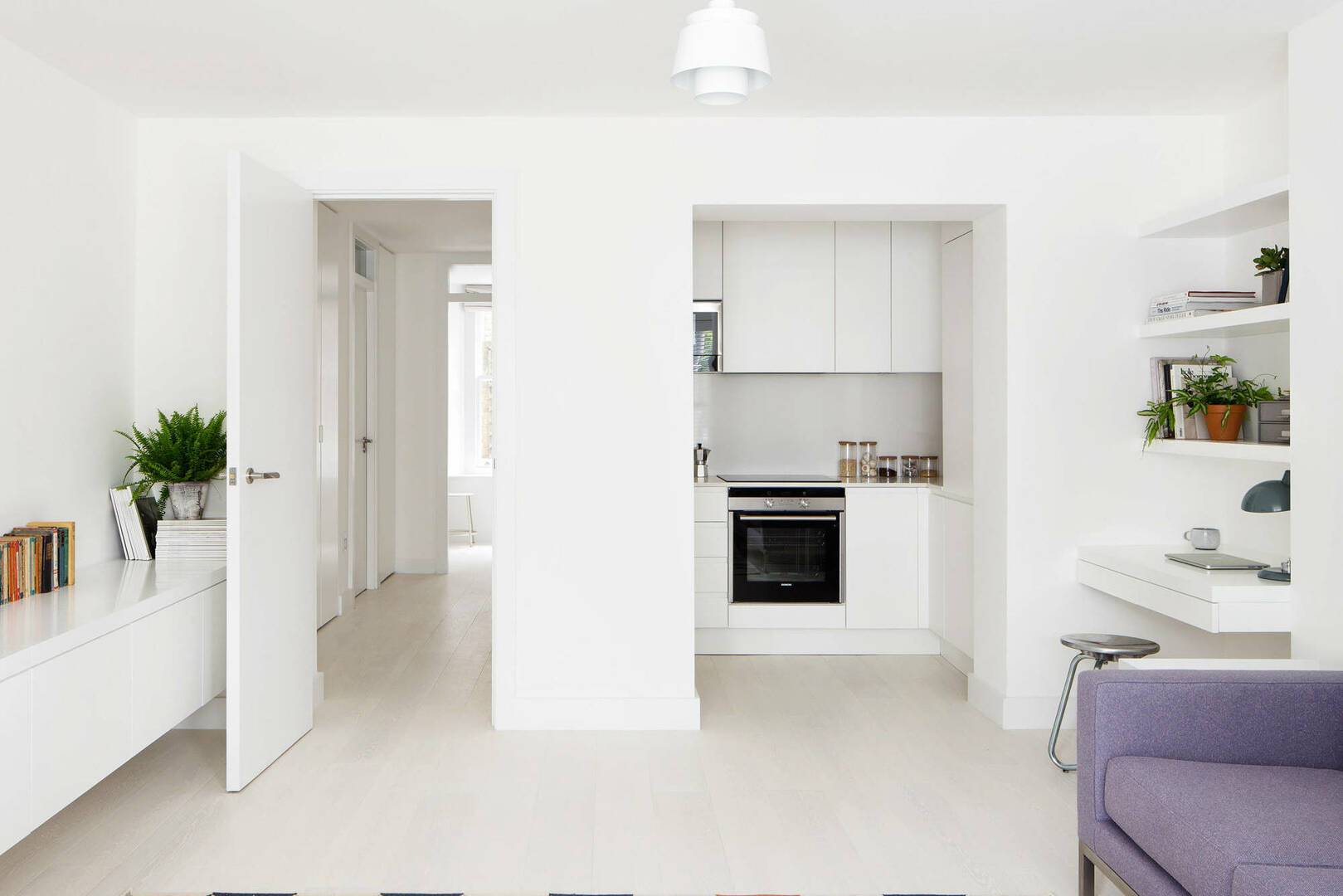 индивидуальное исполнение варианта совмещения кухни и гостиной с использованием одного и того же цвета для стен и гарнитура