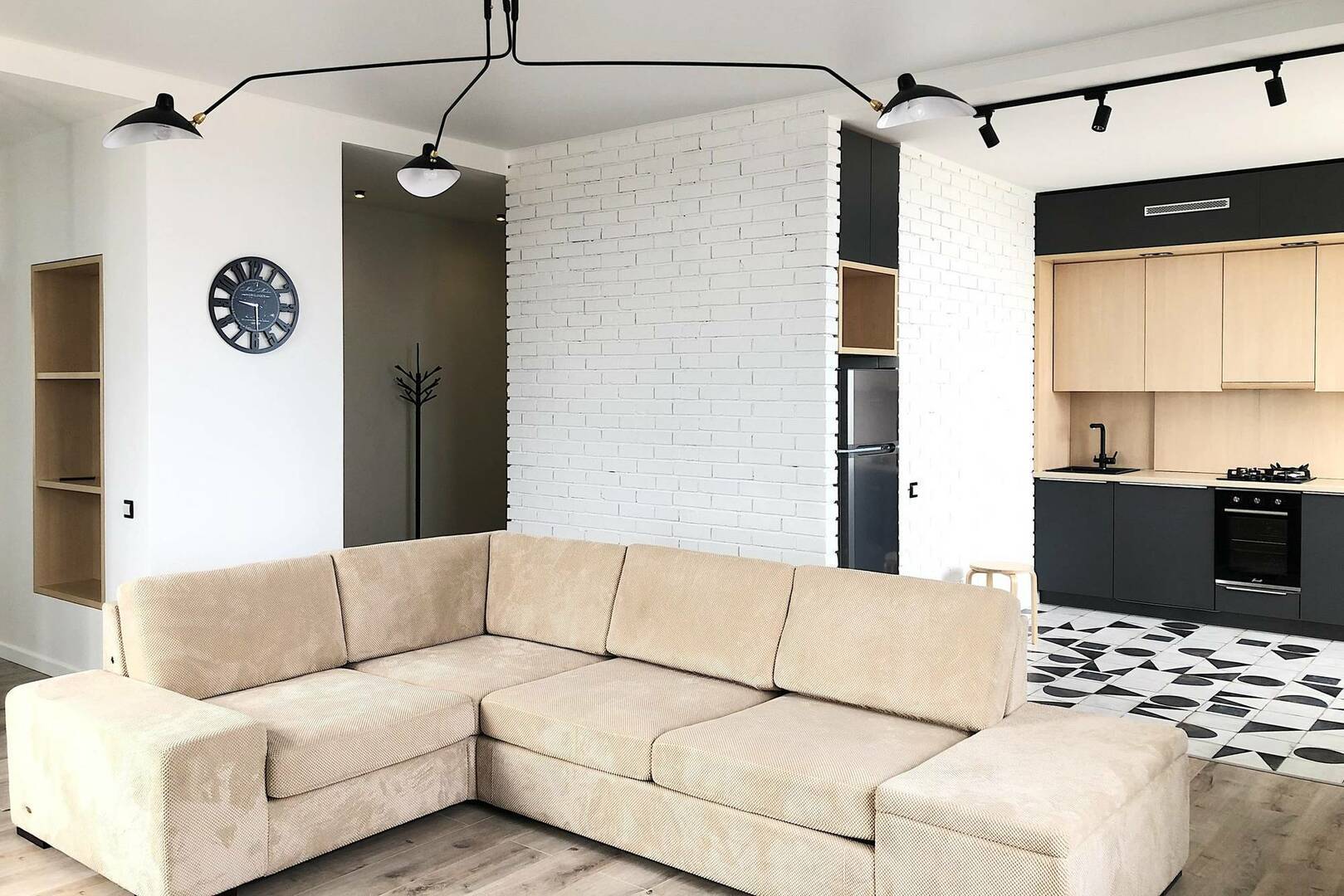дизайнерская перекличка кухни и гостиной через гармонично подобранную цветовую гамму для обоих помещений