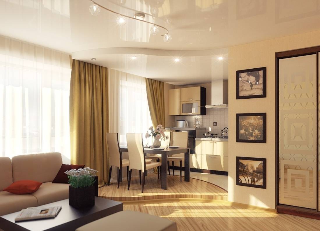 Также хорошим вариантом является разделение на зоны с помощью разного уровня пола. Его можно поднять на кухне выше основного пола на 5—10 см, а в боковую часть подиума поставить точечные светильники, красиво обыграв таким образом данную идею.