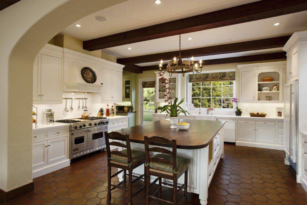 По канону пол в интерьере кухни в деревенском стиле отделан – натуральным камнем, деревянными досками или керамической плиткой. Первые два материала – доступны не каждому. Достойно заменить пол из массива сможет паркетная доска, которая за счет верхнего деревянного слоя не отличается от «оригинала», но стоит дешевле. Самые бюджетные альтернативы дереву – ламинат и более практичный линолеум «под дерево» — современные покрытия высоких классов прочности вполне приятно выглядят и долго служат. Камень можно заменить более доступным и практичным керамогранитом. Плитка подойдет однотонная естественных тонов, с традиционным узором либо классическая черно-белая (для прованса).