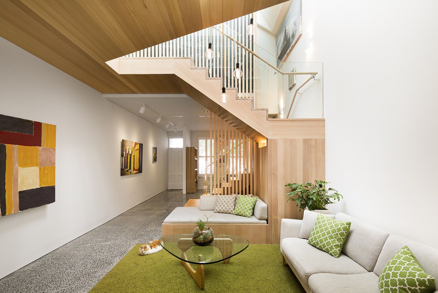 Если сходни ведут на открытый второй уровень, расположите кухню внизу, а наверху сделайте столовую или гостиную. Постарайтесь подобрать перила верхнего этажа так, чтобы они сочетались с декором лестницы.