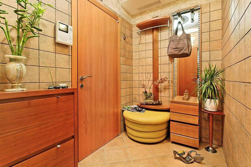 Естественные отделочные материалы здесь будут уместны. Напольное покрытие должно быть деревянным. Стены оклейте натуральными обоями из бамбука. Если квадратура позволяет, организуйте один угол прихожей японскими мотивами. Объемные горшки с зеленым бамбуком будут удачно сочетаться с декоративной сакурой. Подыщите сорт бамбука, который произрастает сочно-зелеными стеблями.