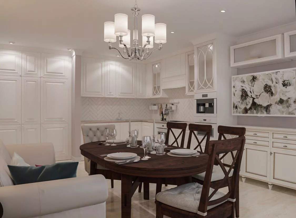Желательно заменить люстру на стеклянную и выбрать круглый стол. Сделайте обеденную группу в одном цвете. А вот в качестве основы для классической кухни этот интерьер подойдет как нельзя лучше.