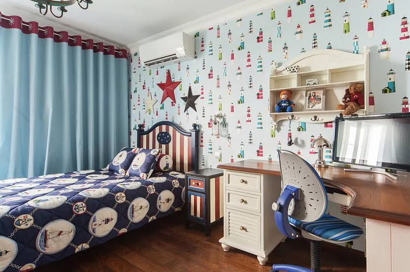 Удачное контрастное и стилевое сочетание в морском интерьере для маленькой комнаты
