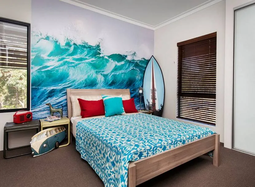 Чаще всего, стены, как и потолок, выступают нейтральным фоном для обстановки. Но не всегда! В некоторых случаях обои или фотообои с морской тематикой берут на себя основную нагрузку по созданию соответствующего настроения.