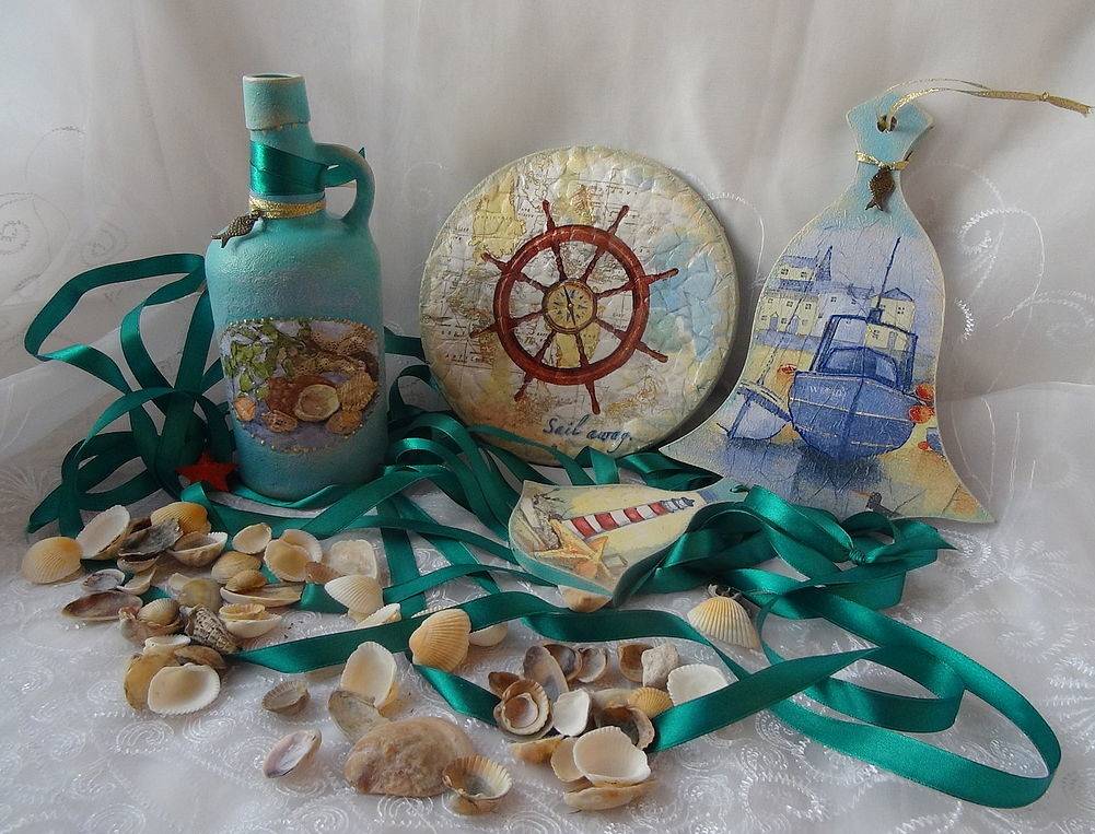- корабельный фонарь, статуэтки кораблей, бутылки из цветного стекла или с загадочным сообщением прямо из моря;