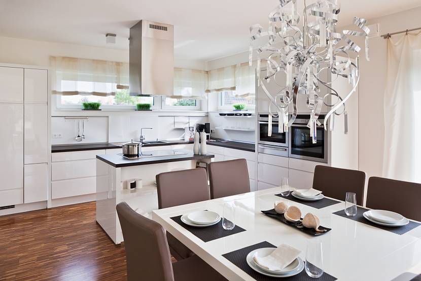 Обеденная зона с дизайнерской люстройИсточник vip-1gl.ru