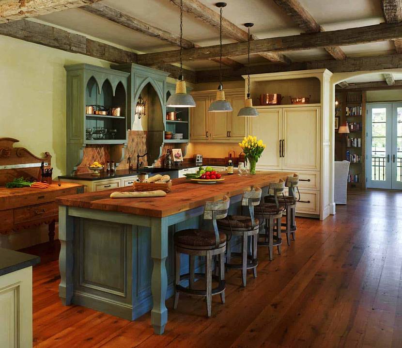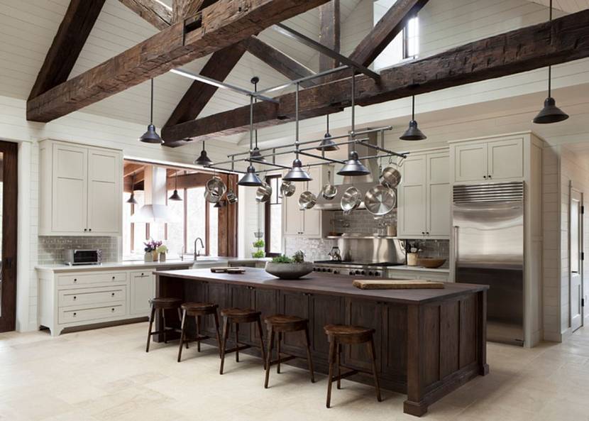 На больших кухнях хороши потолочные балки.