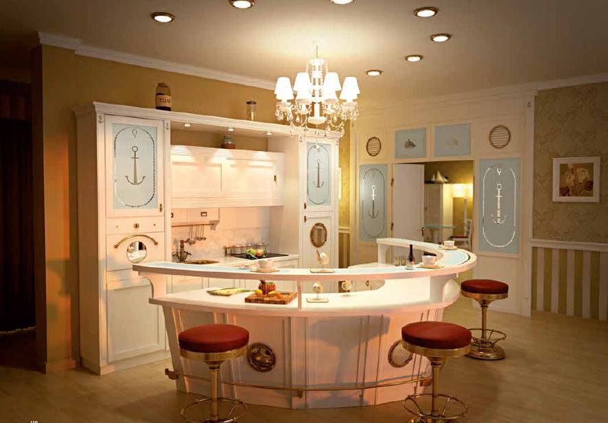 Кухня должна быть хорошо освещена многочисленными небольшими светильниками. В идеале они должны быть в форме морских звезд, рыб. Подходят универсальные небольшие матовые светильники с круглыми плафонами. Великолепно подойдет люстра, в которой плафоны закреплены на основе в форме корабельного штурвала.