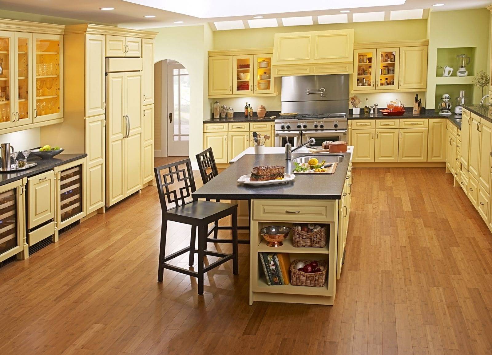 Деревянный пол будет определенно теплым и не только визуально, но и физически, на ощупь. Древесина также имеет хорошую звукоизоляцию, выглядит наиболее натурально из всех типов полов. Обустройство деревянным полом несет в себе признаки комфорта. На кухне можно пролить что-либо на пол, упадет острый предмет, поэтому поверхность должна быть устойчива к влаге и механическим повреждениям.