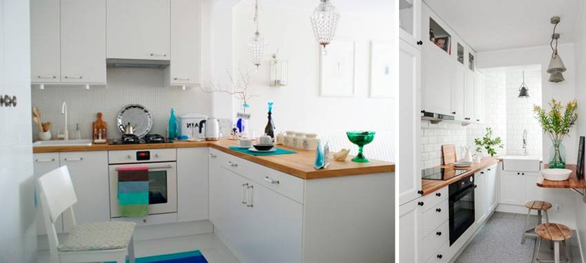 Интерьер маленькой кухни в скандинавском стиле, оформленный в белом цвете с небольшими цветными акцентами, будет выглядеть больше, чем он есть на самом деле. Натуральное дерево, зелень и комнатные цветы придадут белой аранжировке более теплый и уютный вид. При желании в такое оформление можно ввести несколько темных рамок или ярких акцентов – яркий коврик, салфетки или столовую керамику.