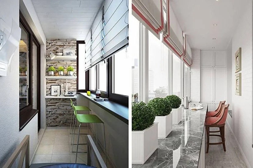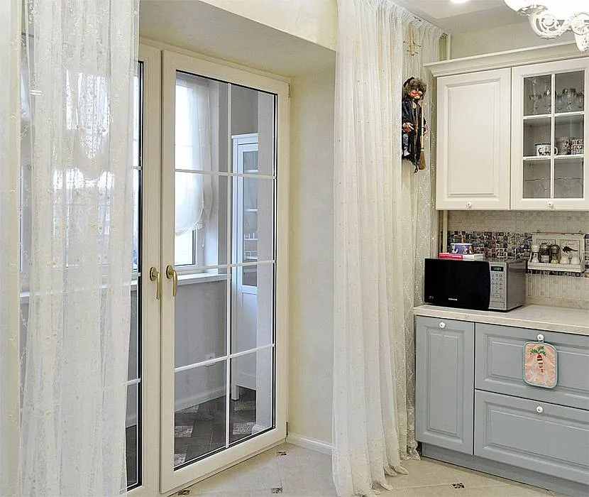На лоджии располагают обеденную зону или барную стойку с видом на улицу. По техническим нормам запрещено объединять балкон с кухней без стеклопакета между ними. Прозрачные двери зрительно соединяют два пространства. Для экономии места используют оконный блок в форме гармошки.