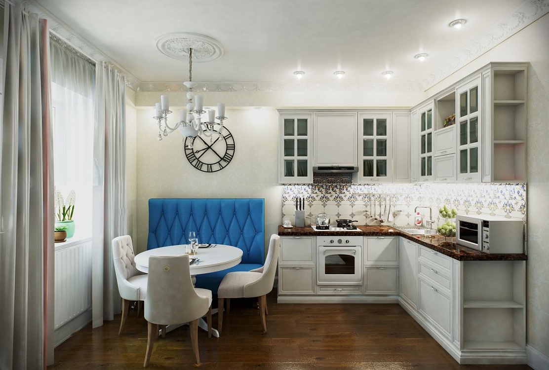 - Исторический стиль – будет хорошо смотреться в таком помещении. Большая кухня в сталинке, дизайн которой будет выполнен в стиле ампира или барокко, потребует финансовых вложений, поэтому такой вариант сложно назвать универсальным. Отделка, мебель, декор – все должно соответствовать уровню