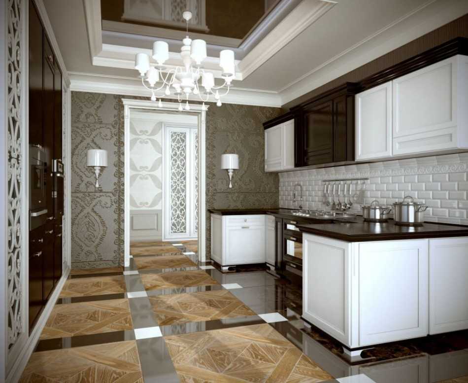 Идеально подойдут наливные полы на кухне или блестящий паркет. В определенных случаях применяется линолеум. Требование стиля — мозаичный рисунок или варианты с клеткой, елочкой и зеброй.