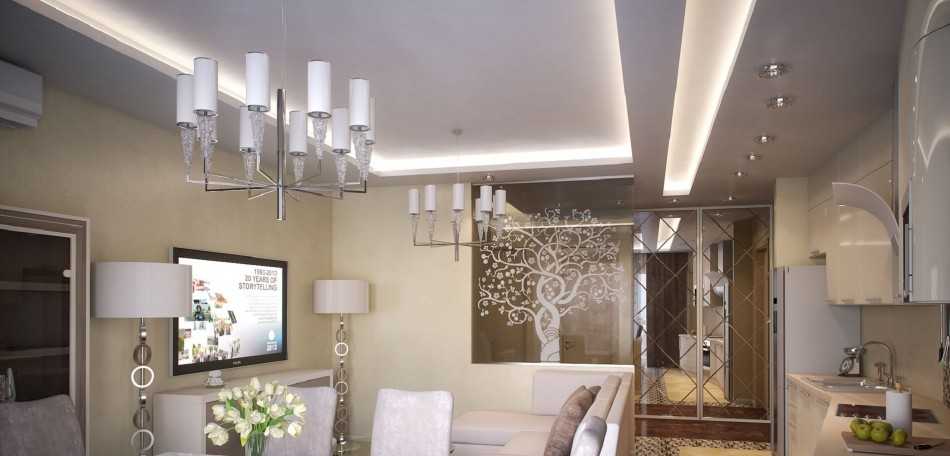 Очень большие по площади помещения освещают двумя хрустальными потолочными люстрами. Они успешно вписываются в светлый интерьер (бежевый, кремовый, реже кофейный), обязательно дополняются шикарной лепниной. На организацию такого потолка уходит уйма времени, но результат превосходит все ожидания.