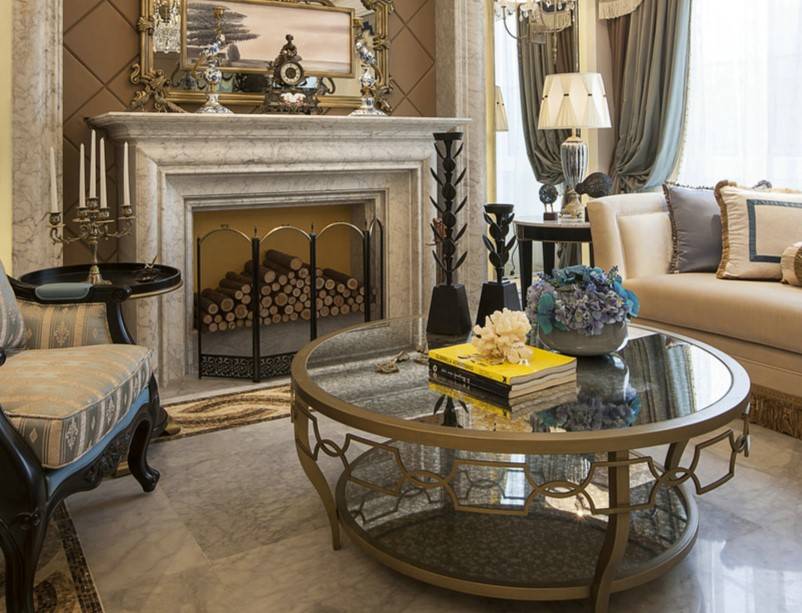 - в отделке активно применяется древесина ценных пород и камень натурального происхождения;