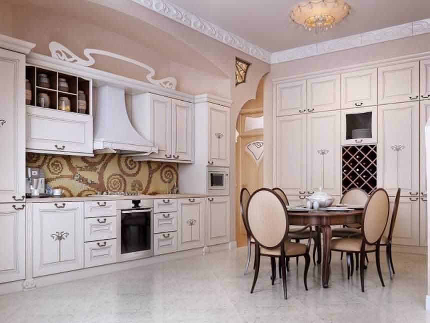 Обстановка кухни арт-деко должно непременно соответствовать самому роскошному стилю в интерьере. Для стен используются виниловые обои и гипсовые панели, а потолок непременно оформляется аристократической лепкой с позолотой. Уместен будет и натяжной потолок, главное — чтобы его конструкция и материал отличались от привычного «скромного» варианта. Лучше всего подойдет многоуровневый потолок с дополнительной подсветкой и необычным сочетанием цветовой палитры. На потолке будет хорошо смотреться немного старомодная, но стильная люстра.