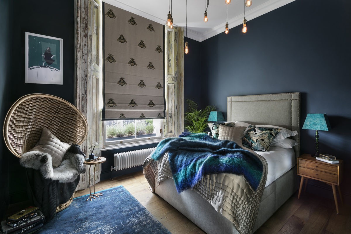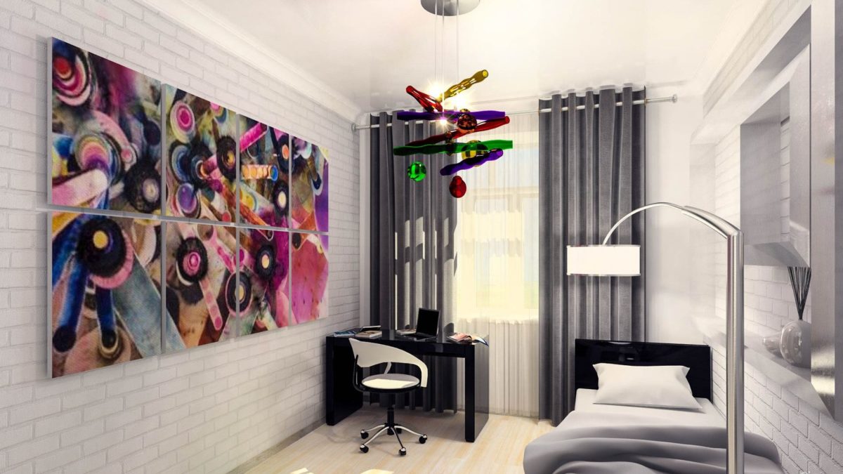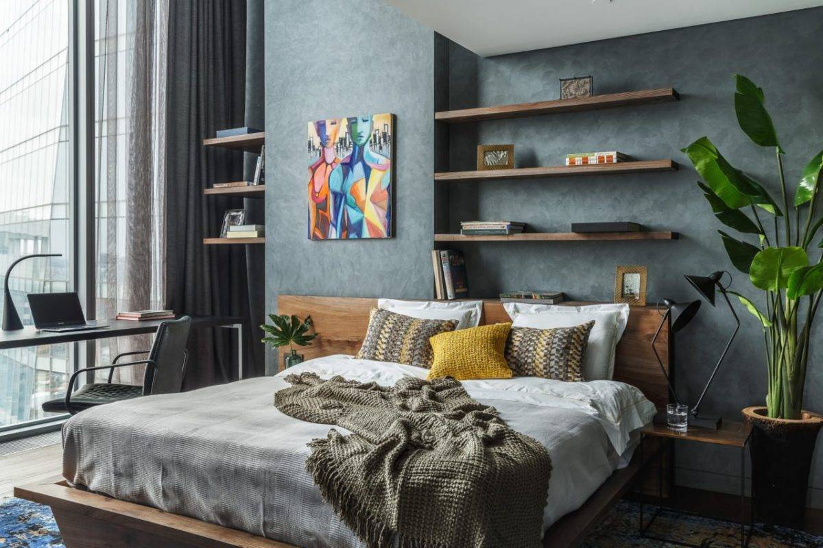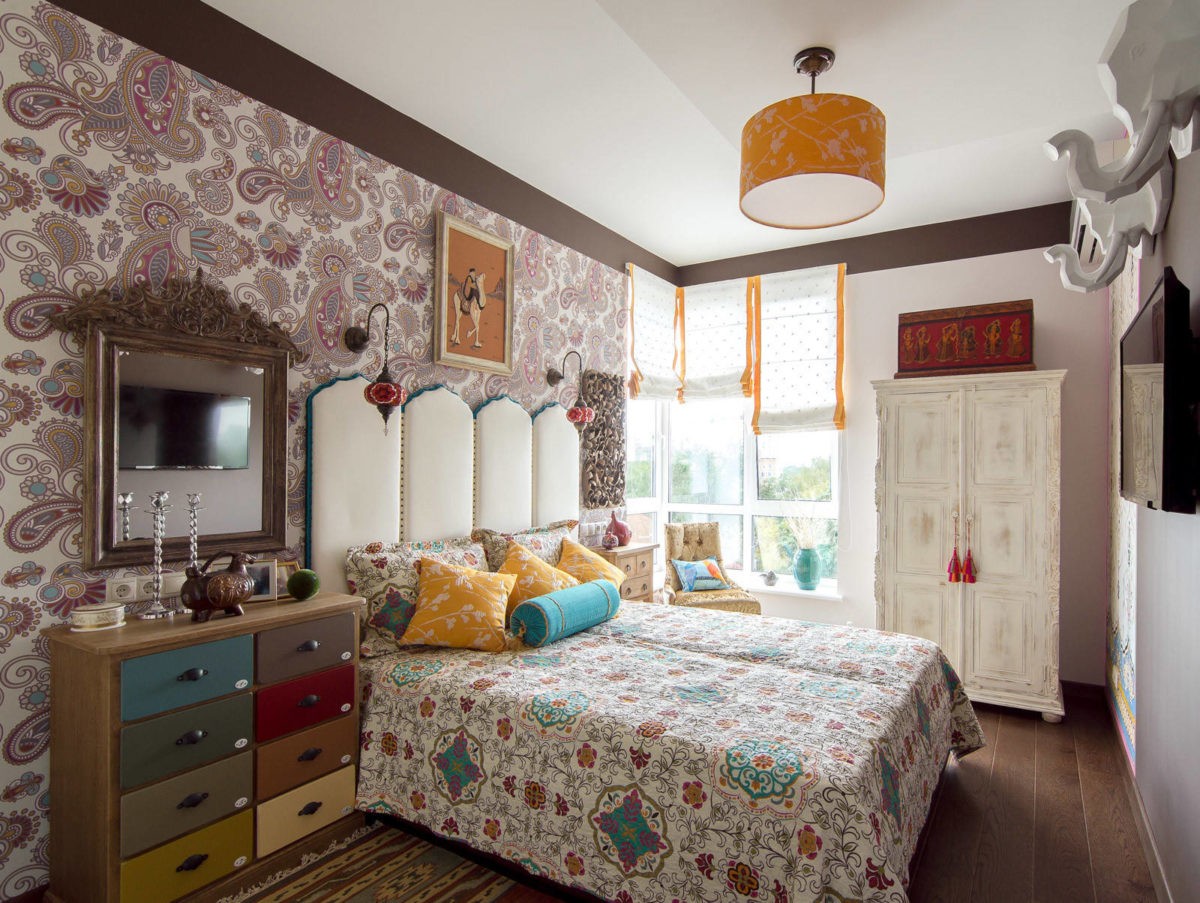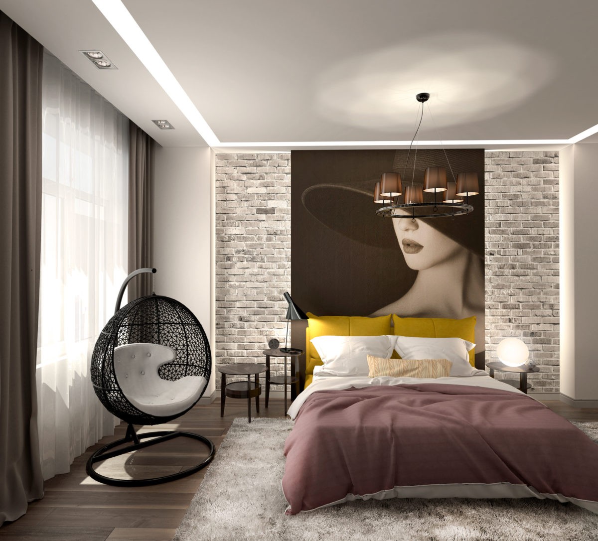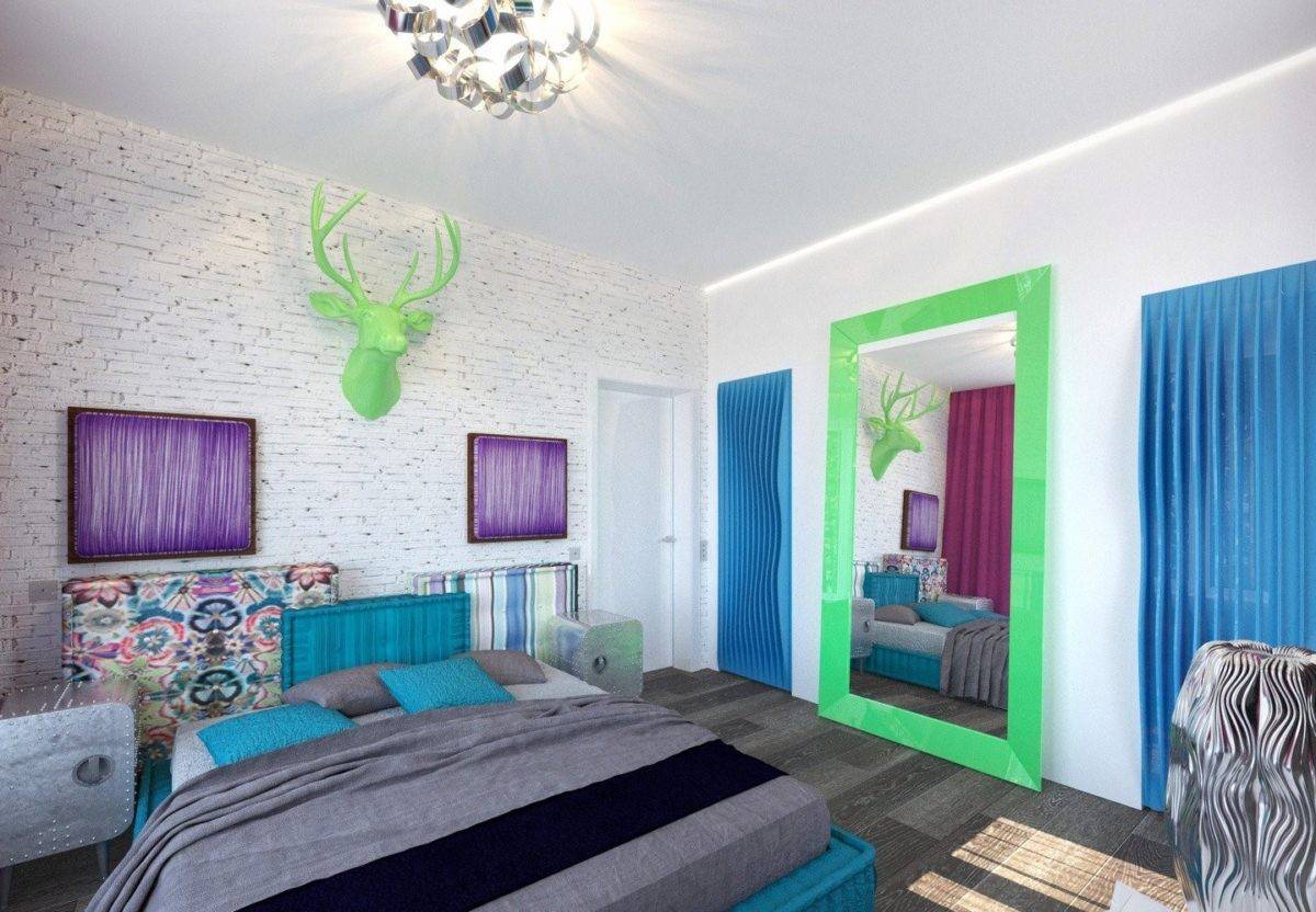 Пёстрые коврики на полу, декоративные светильники, кресло-качалка, картины дополнят концепцию. Если в спальне предусмотрена рабочая зона с письменным столом, то её можно определить с помощью освещения или обустроить с элементами лофта.