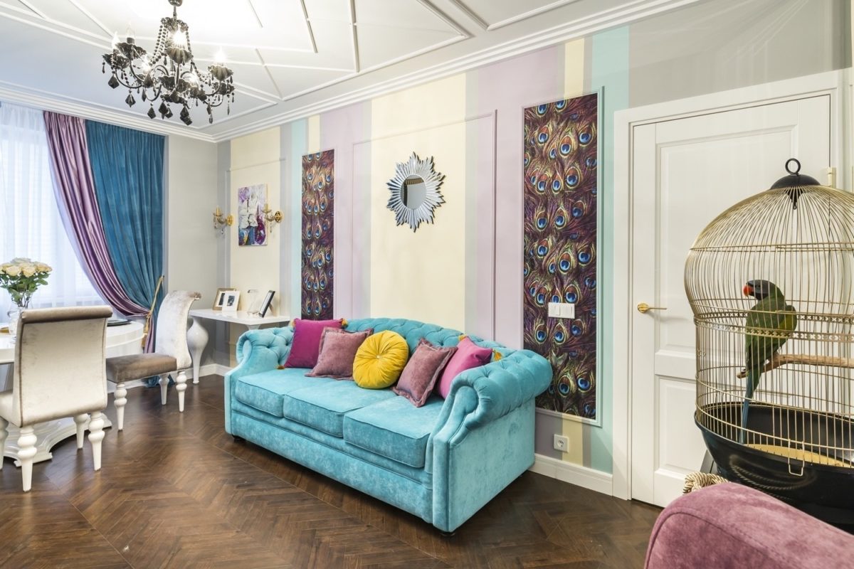 - Взрыв цвета. При оформлении одного и того же помещения можно сочетать совершенно разные яркие цвета, например, зелёный с розовым, бирюзовый с красным, золотой с оранжевым. Однако о гармоничном сочетании забывать нельзя.