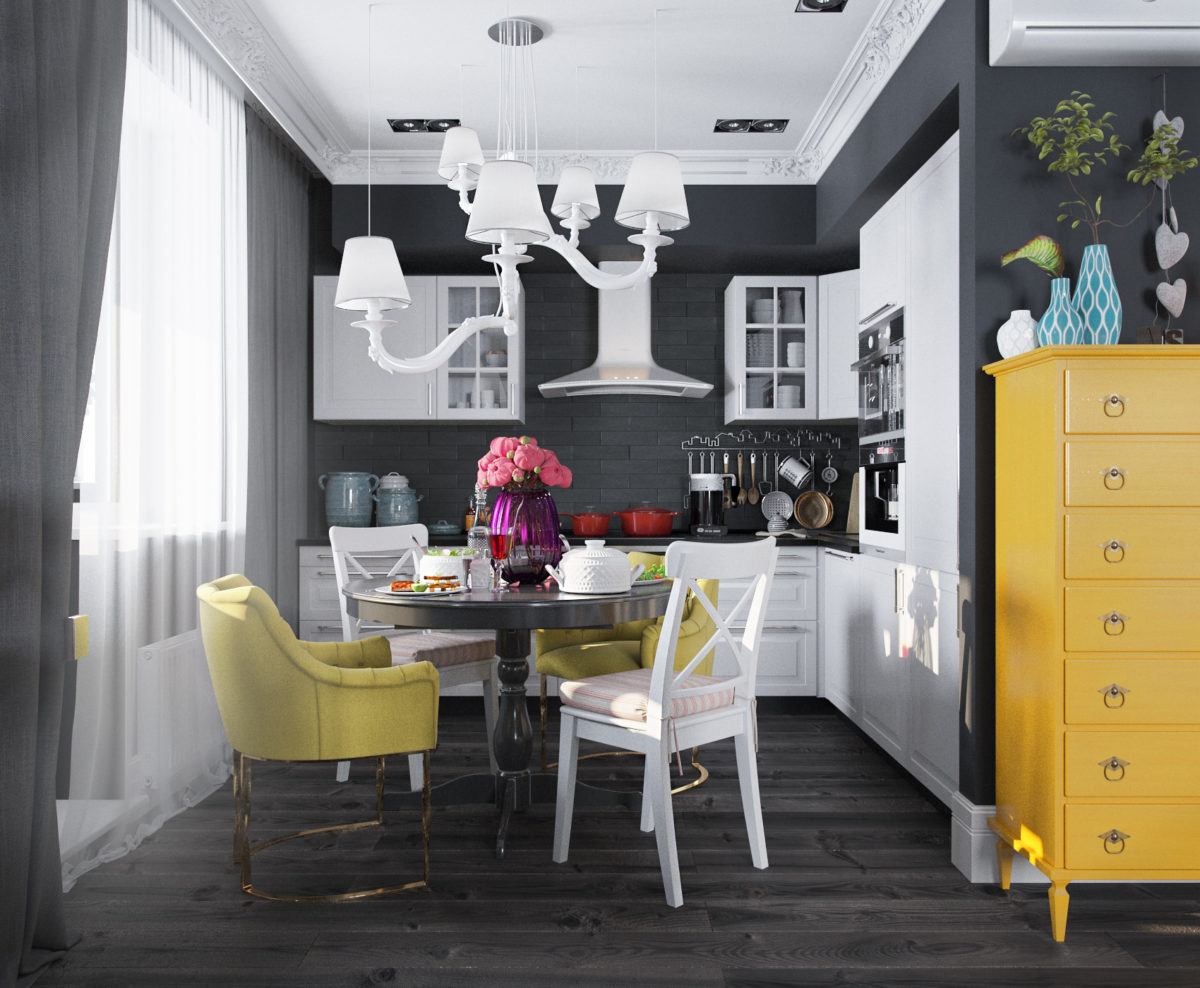 Наибольшей популярностью пользуется бело-черная комбинация. Разнообразьте этот дуэт яркими вкраплениями (изумрудными, желтыми, красными), и вы создадите стильный кухонный интерьер с современными чертами.