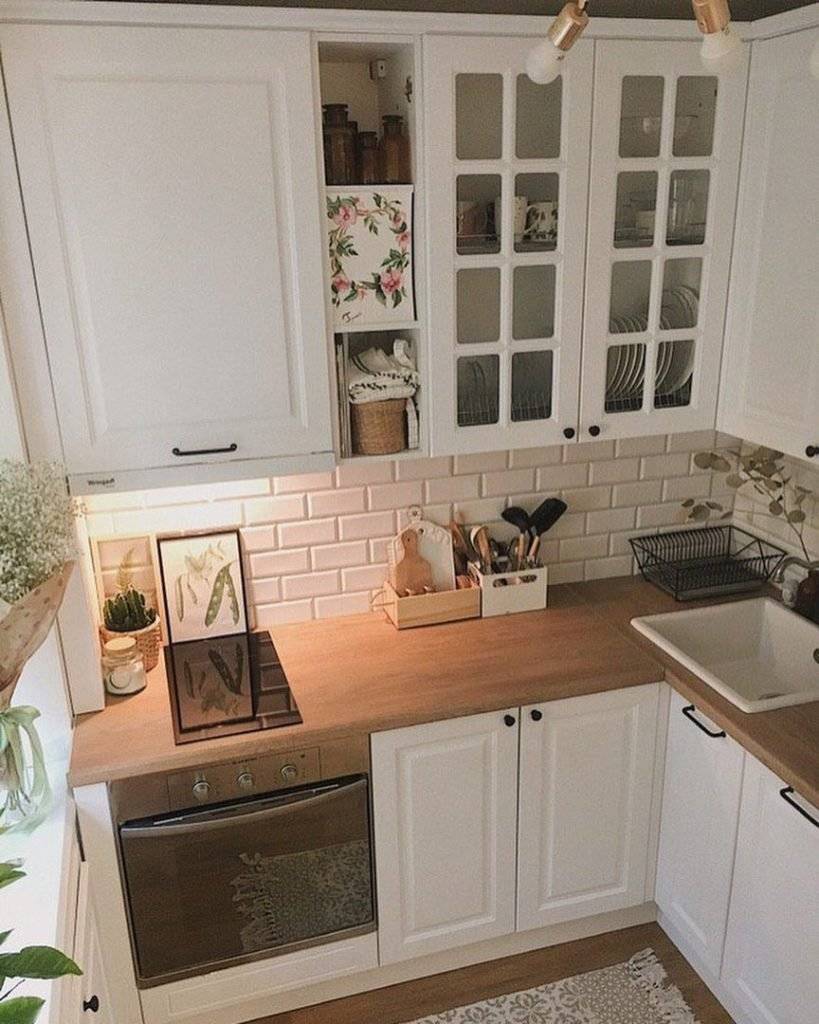 Стены, декорированные древесной отделкой, сочетающиеся с белыми шкафами прямоугольной формы и столешницей. Фартук составленный из светлой мозаики и раковина из камня. Набор тематических ложек и плетёные короба. Всё это призвано гармонировать с концепцией, вызывающей иллюзию старины.