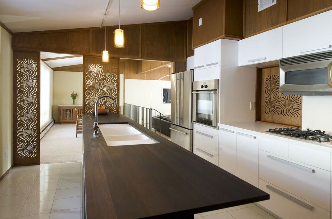 Варианты дизайна кухни из этого пункта без большого бюджета и составления дизайн-проекта не стоит даже пытаться воплощать. Но отдельные фишки можно подсмотреть.