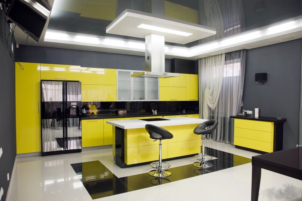 Фасады кухни обычно глянцевые, яркого или темного цвета. Фурнитура неприметная или вовсе отсутствует – ручки шкафов заменяют механизмы открывания нажатием. Однако стоит учесть, что на глянцевых фасадах неизбежно будут оставаться следы от пальцев рук.