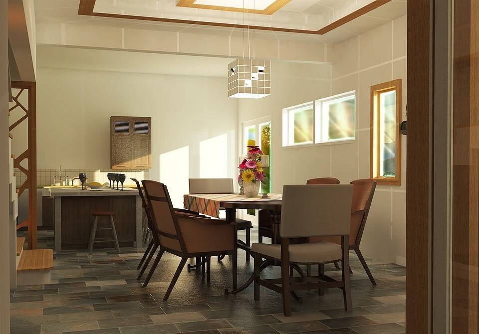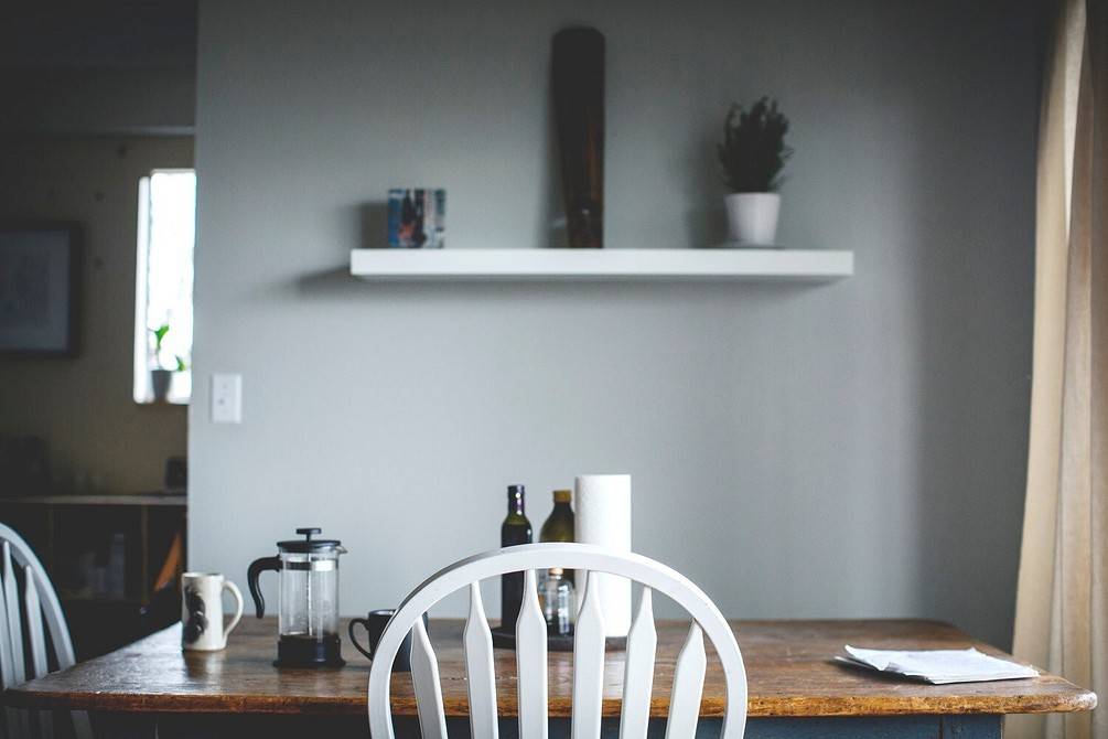 - В выборе мебели предпочтение отдаётся удобному, но не слишком массивному деревянному столу и стульям; пластик или стекло разрушат ощущение домашней обстановки. Комнату украсят вместительные системы хранения: полки, напольные и навесные шкафы.