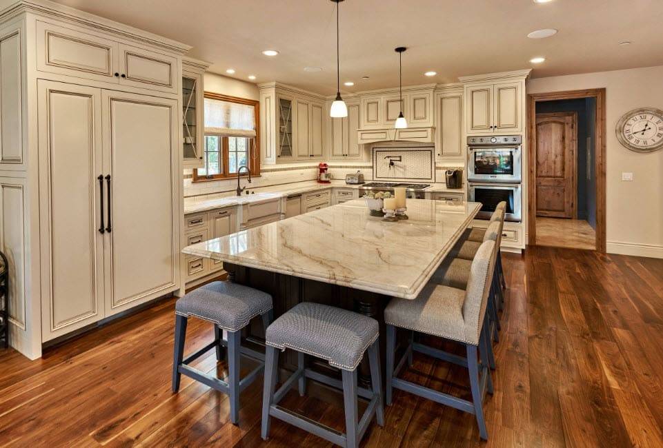 Кухня в стиле прованс с островком — отличное решение для большого помещения. Удобное расположение островка позволяет хозяйке с комфортом заниматься приготовлением пищи, создает дополнительную рабочую поверхность, а его вместительная внутренняя зона станет прекрасным местом для хранения приборов.