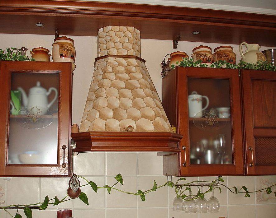— очаг – разумеется, украсить электрическим камином можно далеко не каждую кухню – площадь не позволяет. Можно обустроить имитацию печи, сделав полукруглую нишу и притворив её дверцей. Но ничто не мешает отвести роль очага декоративному вытяжному колпаку белого цвета, добавив эксклюзивной росписи или наклеек с растительным орнаментом.