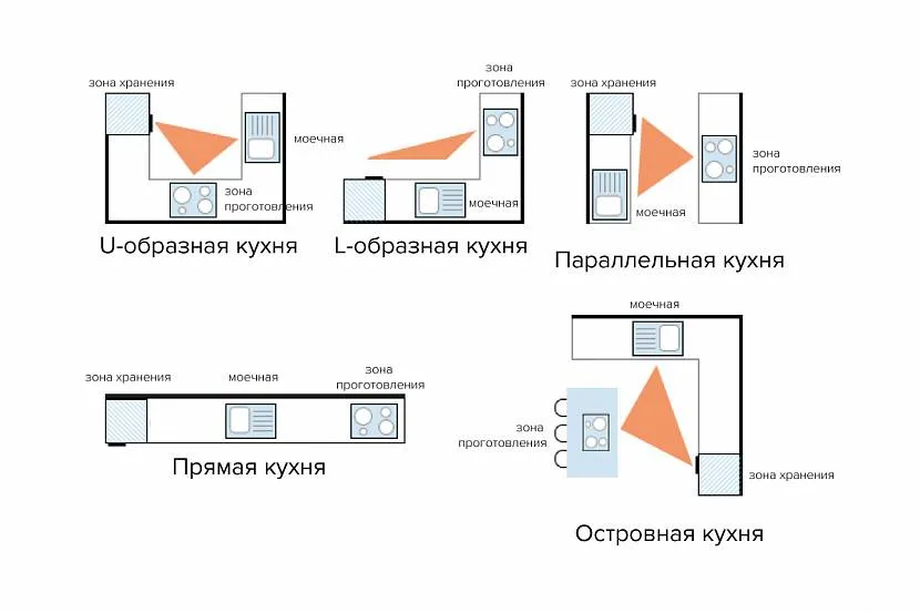 Чтобы малогабаритное помещение соответствовало требованиям эргономики, нужно грамотно распределить зоны. Правило «рабочего треугольника» позволяет минимизировать нагрузку во время приготовления пищи. Вершинами фигуры являются: