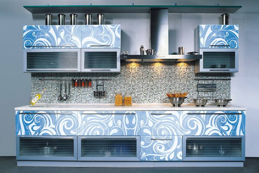 Самый не сложный метод — рисунок наносится непосредственно на саму пленку, а последнюю уже клеят на кухонный фасад. Такой способ достаточно бюджетный и быстр в своем исполнении, кроме того пленка хорошо себя зарекомендовала, как влагоустойчивая. Используя данный вид, возможно, нанести на кухонный гарнитур любую желаемую картинку или фото.
