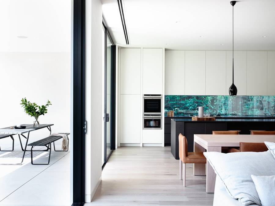 Минусы: несмотря на закалку, стекло остается довольно хрупким материалом. Но кухонный фартук не испытывает большие механические нагрузки, поэтому скинали используют все чаще. Еще один недостаток — стекло придется мыть чаще, потому что загрязнения видны сразу.