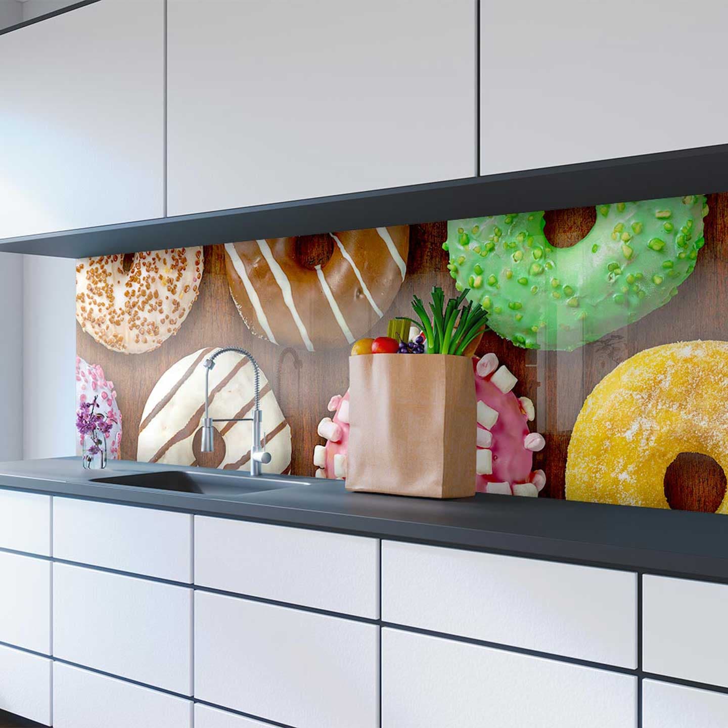 Панели МДФ часто путают с ДСП, так как производятся они также из древесной стружки. Название МДФ происходит от английского MDF, что является сокращенным вариантом полного названия Medium Density Fiberboard – на русском это означает средне-плотная древесно-волокнистая панель. Для кухни выпускаются разной толщины — от 3 до 10 мм. Поверхность покрывают защитной пленкой, на которую наносится рисунок. Часто подбирают узор, повторяющий рисунок столешницы, но также возможно изготовить фотопечать с любым рисунком.