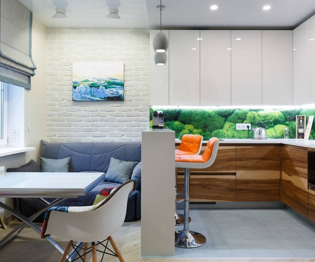 - Если комната маленькая, то и рисунок не должен быть крупным. В противном случае он будет привлекать слишком много внимания и зрительно уменьшать пространство. Можно быть пейзаж или повторяющийся орнамент — так небольшие кухни даже эконом класса будут выглядеть просторнее.
