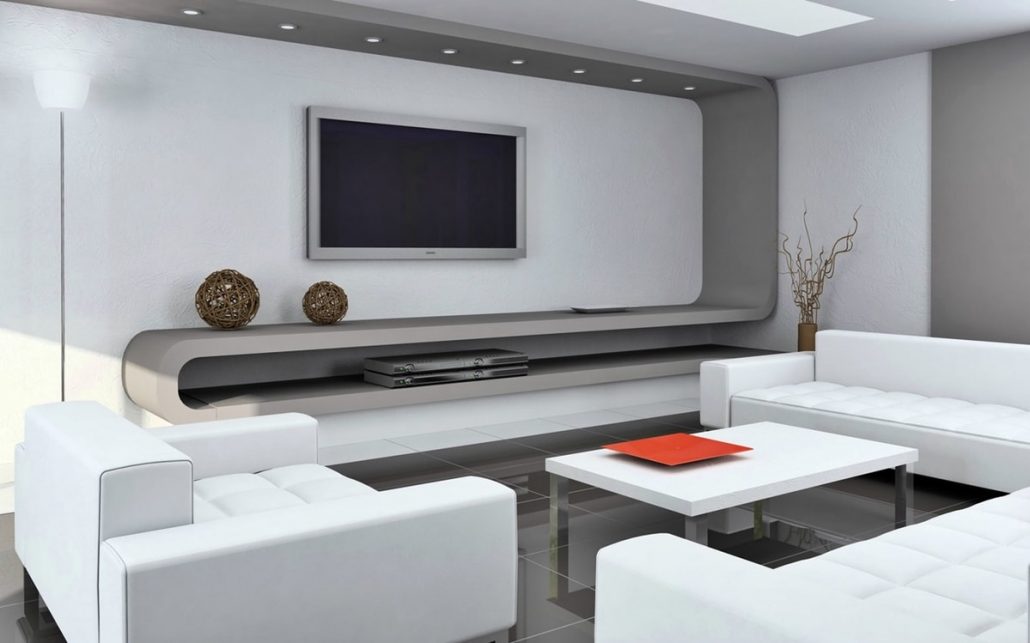 В некоторых зонах комнаты будут уместны точечные светильники, вмонтированные в потолок или ниши. Такой вариант станет отличным дополнением к более выраженным моделям из стекла и металла с необычными формами.