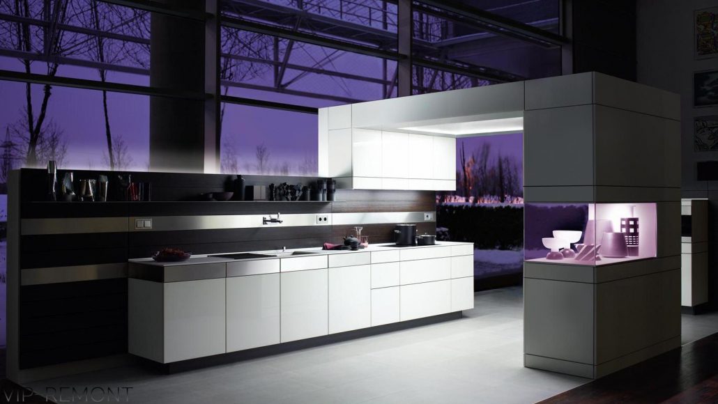 Led-подсветка идеально вписывается в высокотехнологичный, хромированный хай-тек: такое решение помогает создать эффект «парящего» гарнитура.. В случае, если самостоятельно вы не можете спроектировать освещение кухни, обратитесь к профессиональному дизайнеру интерьера